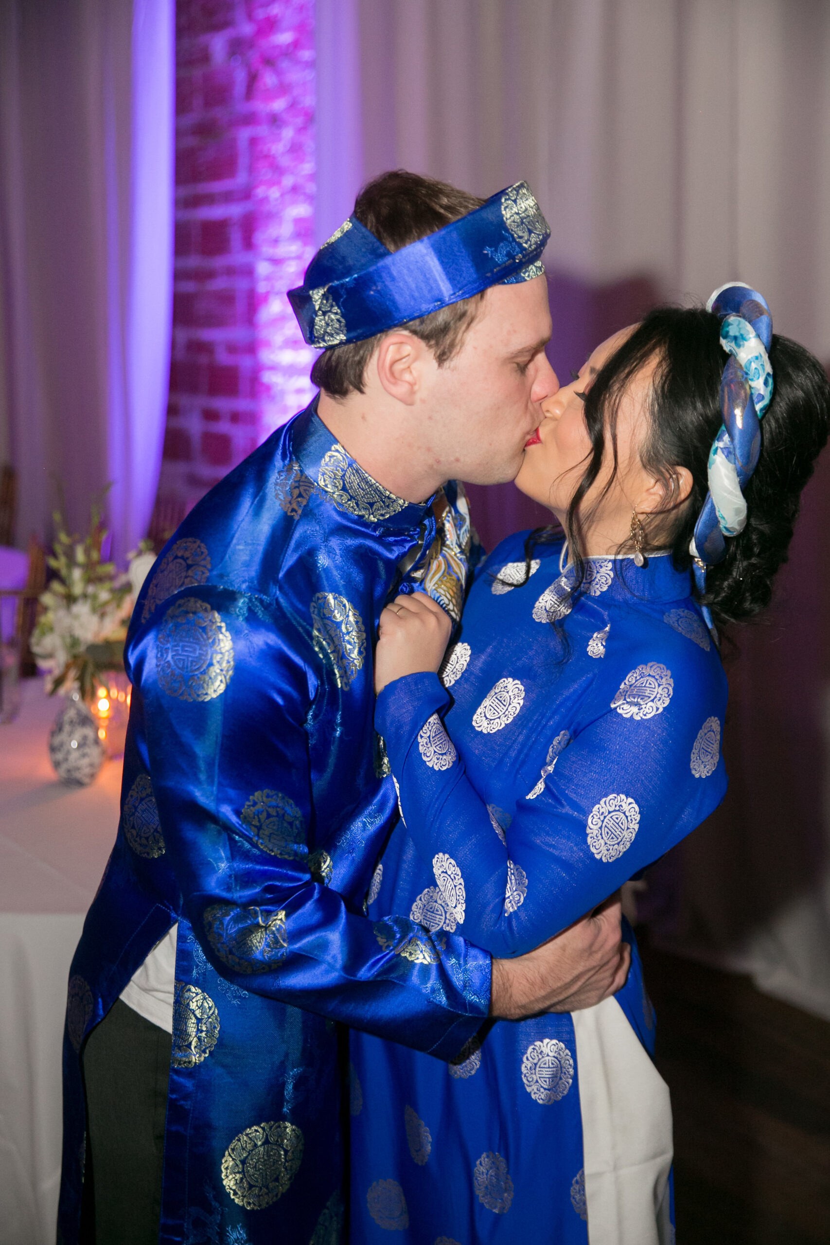 “Blue was chosen because it is my favorite color and the color of my sapphire engagement ring. Purple, because it is Casey’s favorite color. Finally, red and gold for the Vietnamese New Year,” the bride shared.