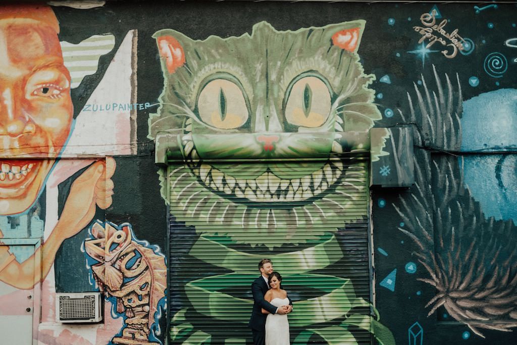 Modern Downtown St Pete Wedding Portrait With Street ArtRustic Modern Wedding Reception at historic DTSP venue NOVA 535 gorgeous Dessert Table with Blue and Pink Floral Round Two Tiered Wedding Cake on Gold Cake Stand and Finally Stylish Gold Cake Topper with Rustic Wooden Crates and Cupcakes | pink boho chicModern Wedding Reception First Dance Portrait | historic Downtown St Petersburg Wedding Venue NOVA 535 | pink boho chic decorOutdoor Wedding Exit Portrait at St. Pete, FL historic DTSP venue NOVA 535 with Sparklers and pink boho Blush Floral with Greenery and White Ribbon Bouquet.