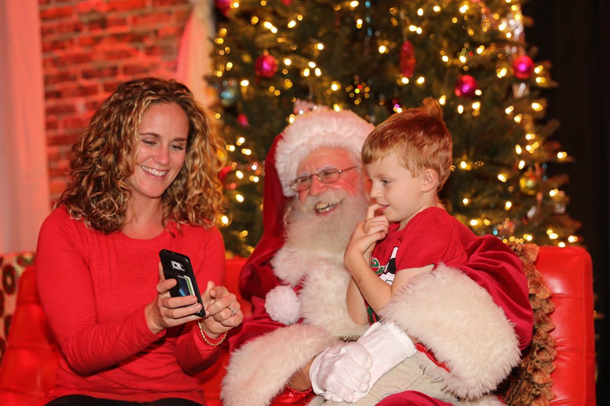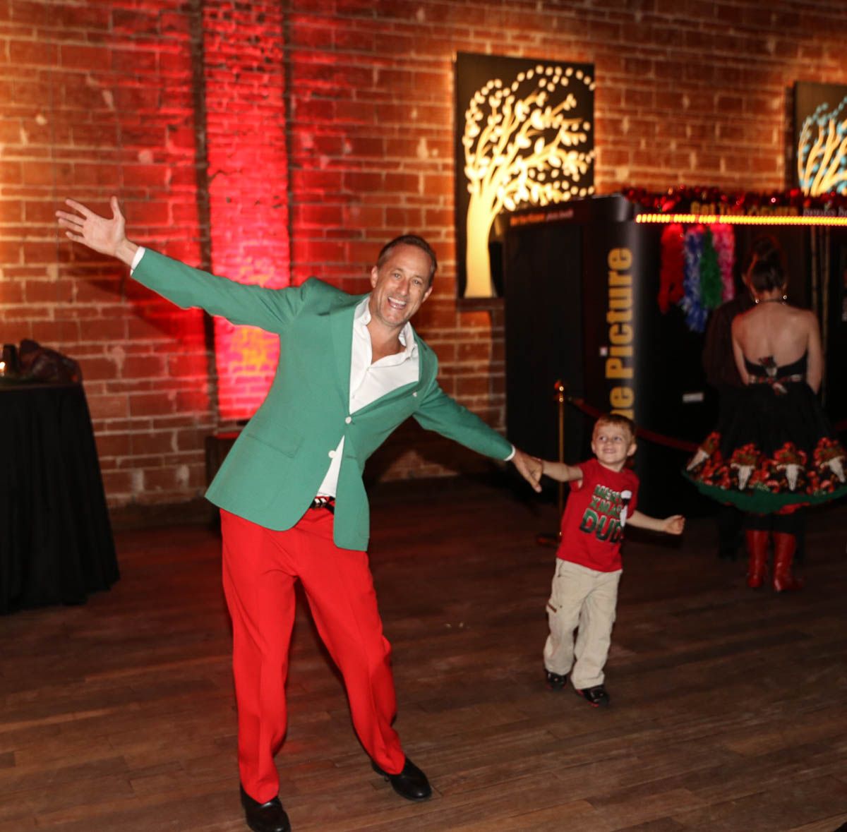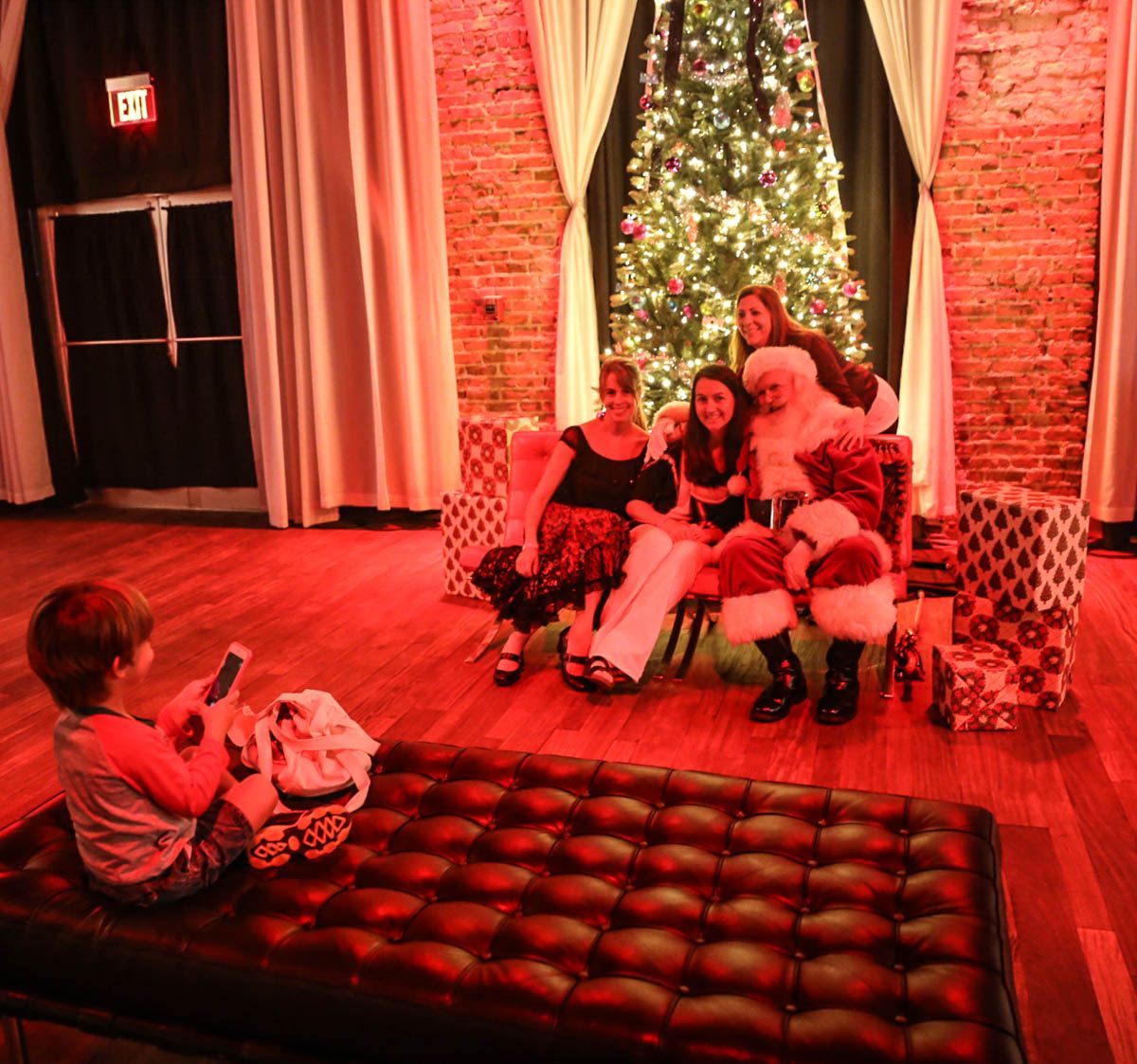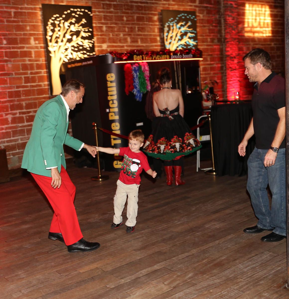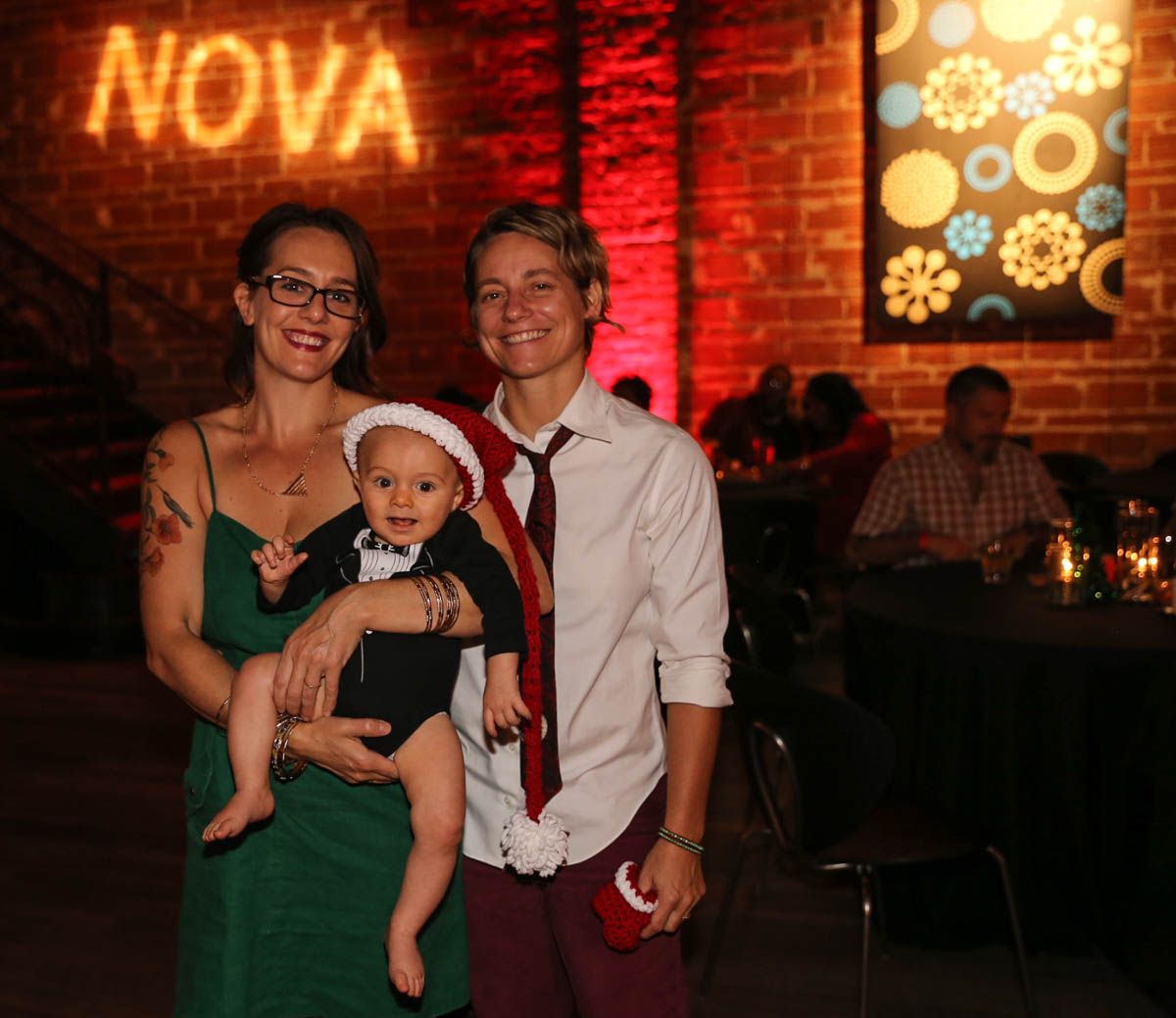 As families walked through the entrance of the historic building, the beautiful mood lighting and enormous Christmas tree made it feel as though they stepped into a winter wonderland. Guests enjoyed a scrumptious meal prepared by Murray’s Chicago Deli and the spread included fire-grilled salmon that melted in your mouth (Bravo Murray, we love having you at NOVA 535!). The kids were having innocent fun and the adults were schmoozing and boozing, then the man of the hour arrived – Santa Claus (played by the incredible Ross Tarr). With countless opportunities for photos, he truly was a magical presence. Not only did Mister Red Suit provide fun for the families, Get The Picture was also in the house with plenty of holiday props to play with in the photo booth (Thanks Mark and Shelli for always creating fun for the guests! Did you know that they just celebrated their 20 year wedding anniversary at NOVA 535?).