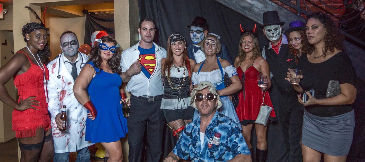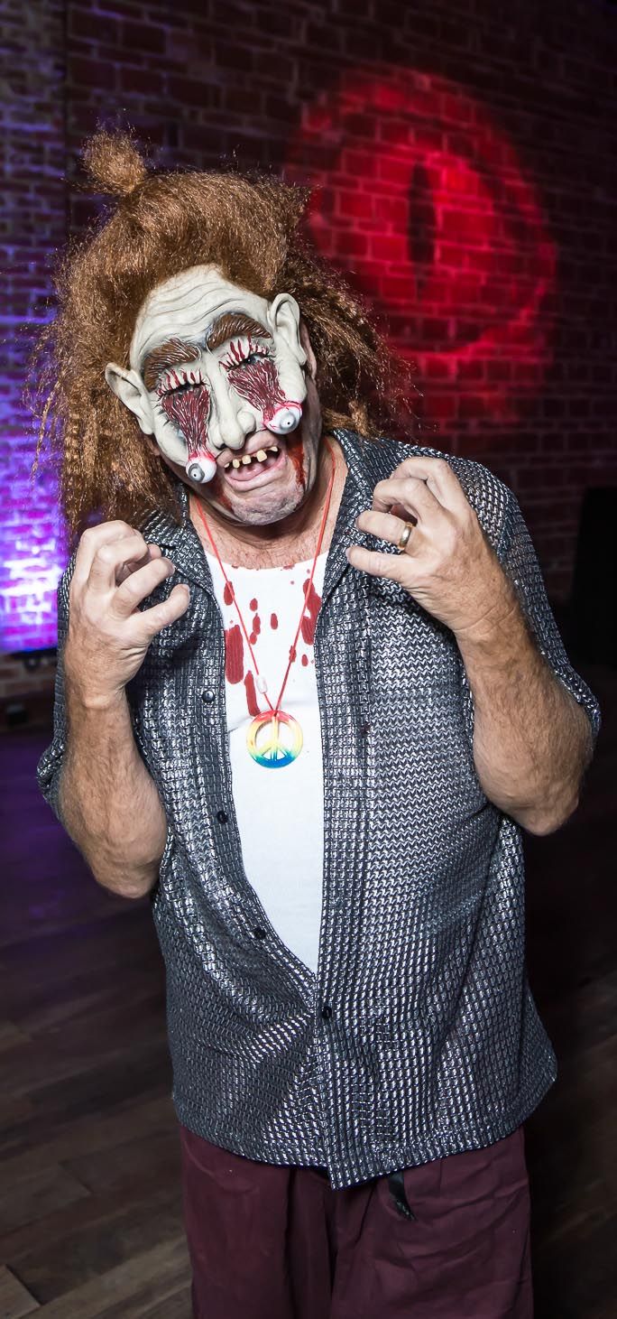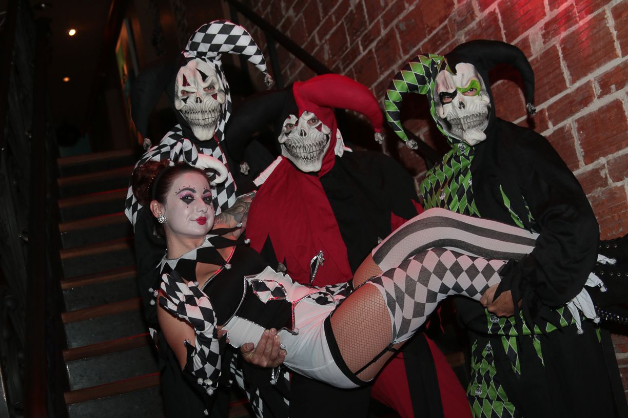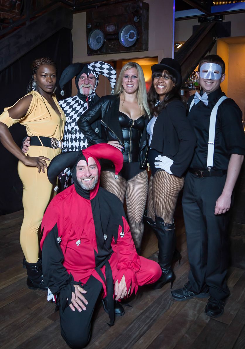 Daniel Jefferson, aka Motown Pride, center as angel in white, was our host and birthday boy, here with his Got Jokes crew and many of their special friends who came out to celebrate #8! 2014-10-31-NOVAWEEN-8-novaween-gobo-stairs-masked-killer