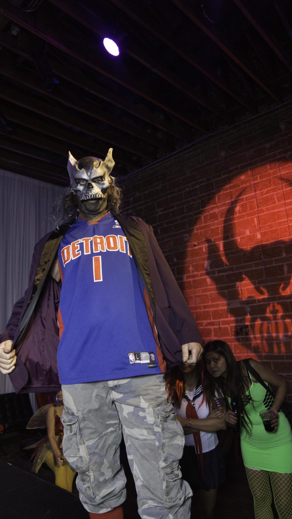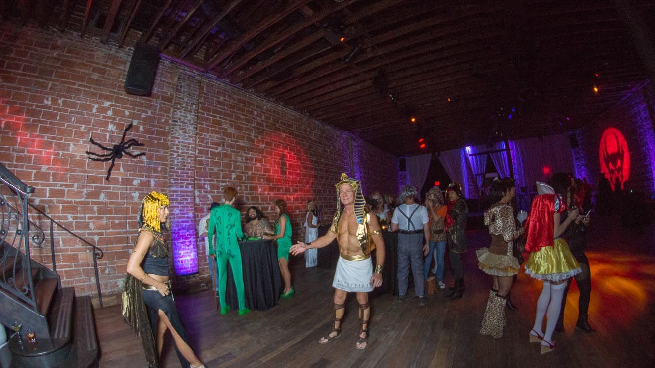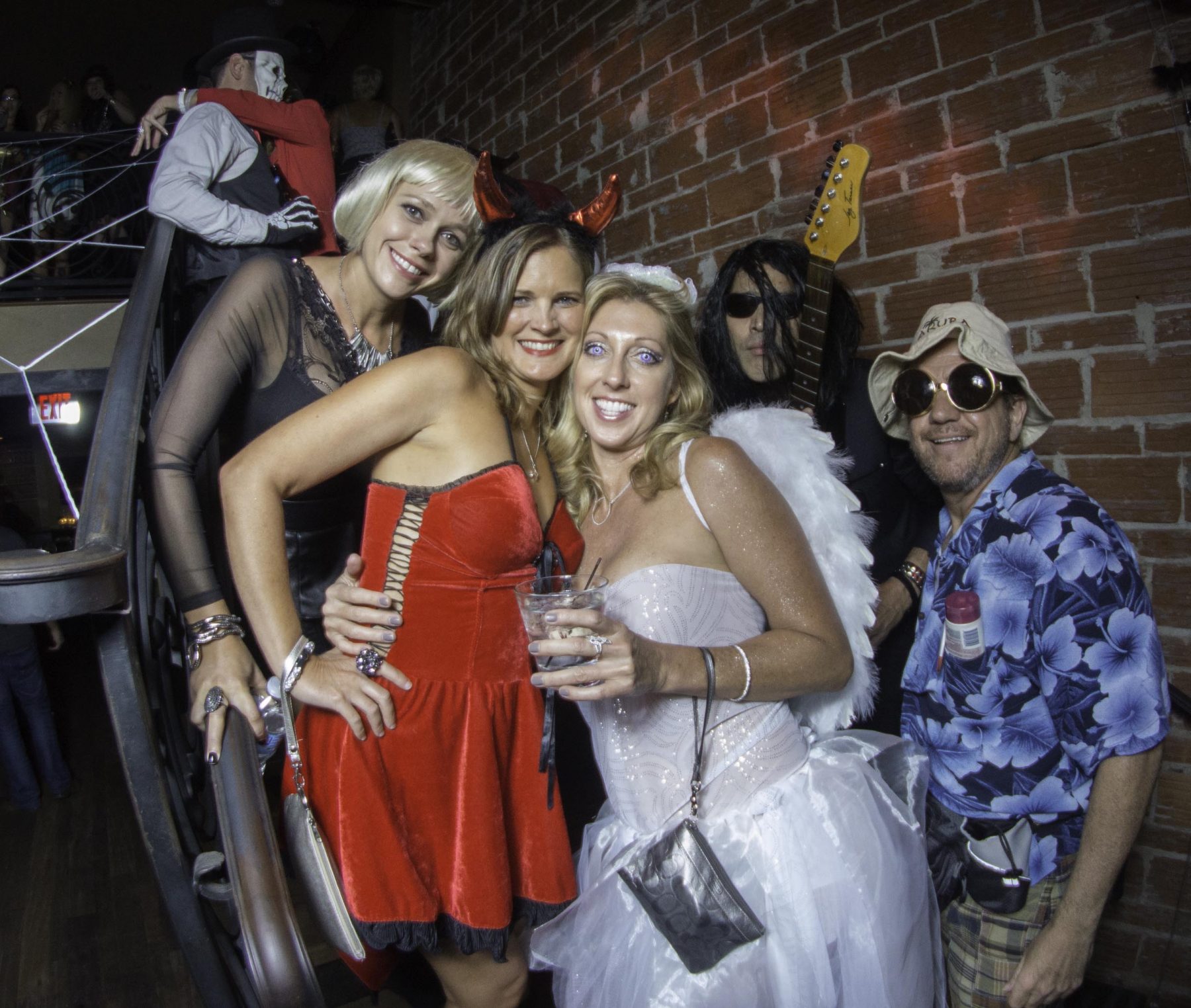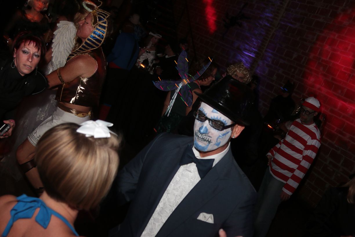 Daniel Jefferson, aka Motown Pride, center as angel in white, was our host and birthday boy, here with his Got Jokes crew and many of their special friends who came out to celebrate #8! 2014-10-31-NOVAWEEN-8-novaween-gobo-stairs-masked-killer