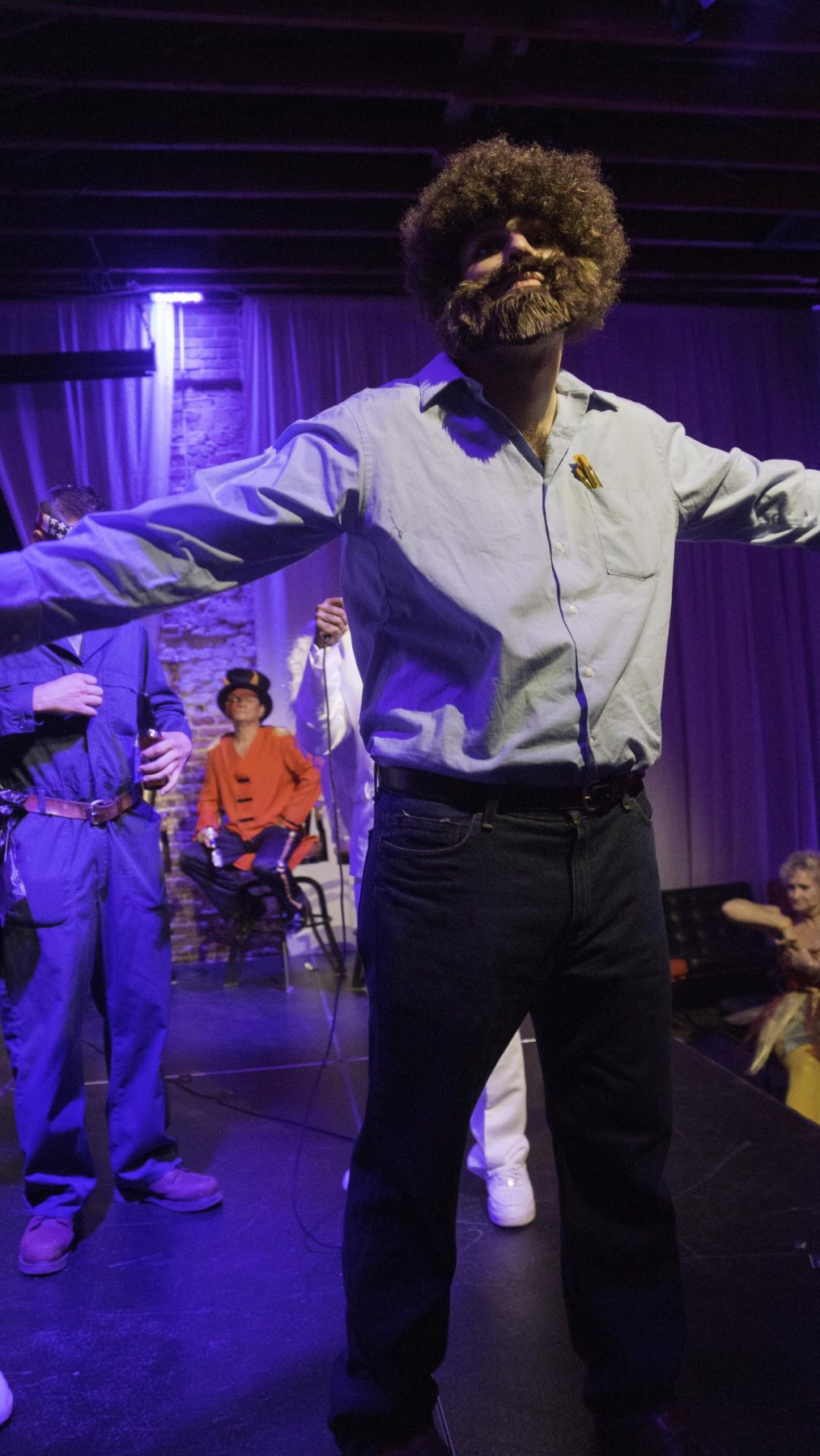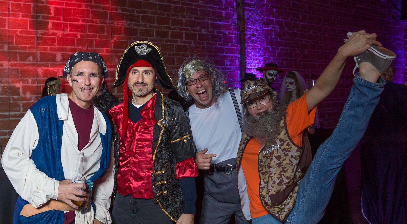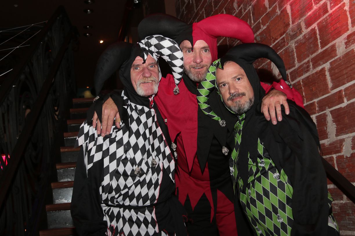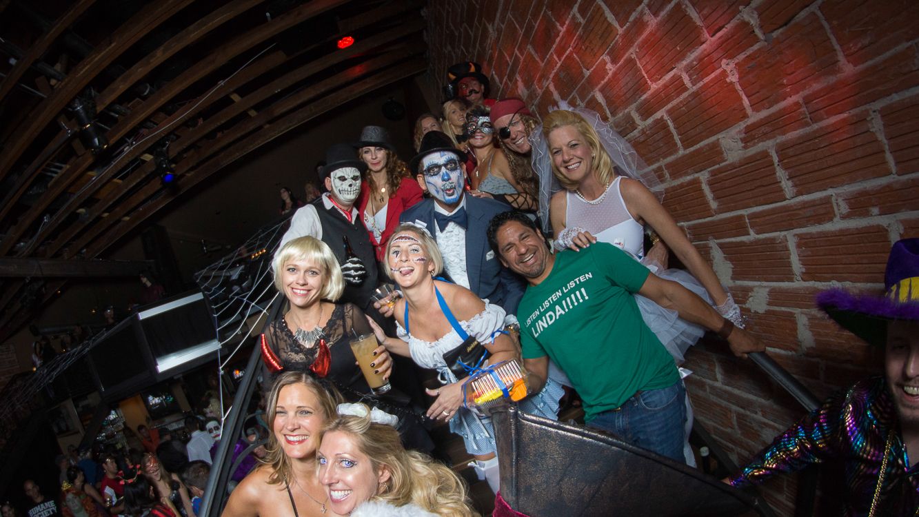 Daniel Jefferson, aka Motown Pride, center as angel in white, was our host and birthday boy, here with his Got Jokes crew and many of their special friends who came out to celebrate #8! 2014-10-31-NOVAWEEN-8-novaween-gobo-stairs-masked-killer