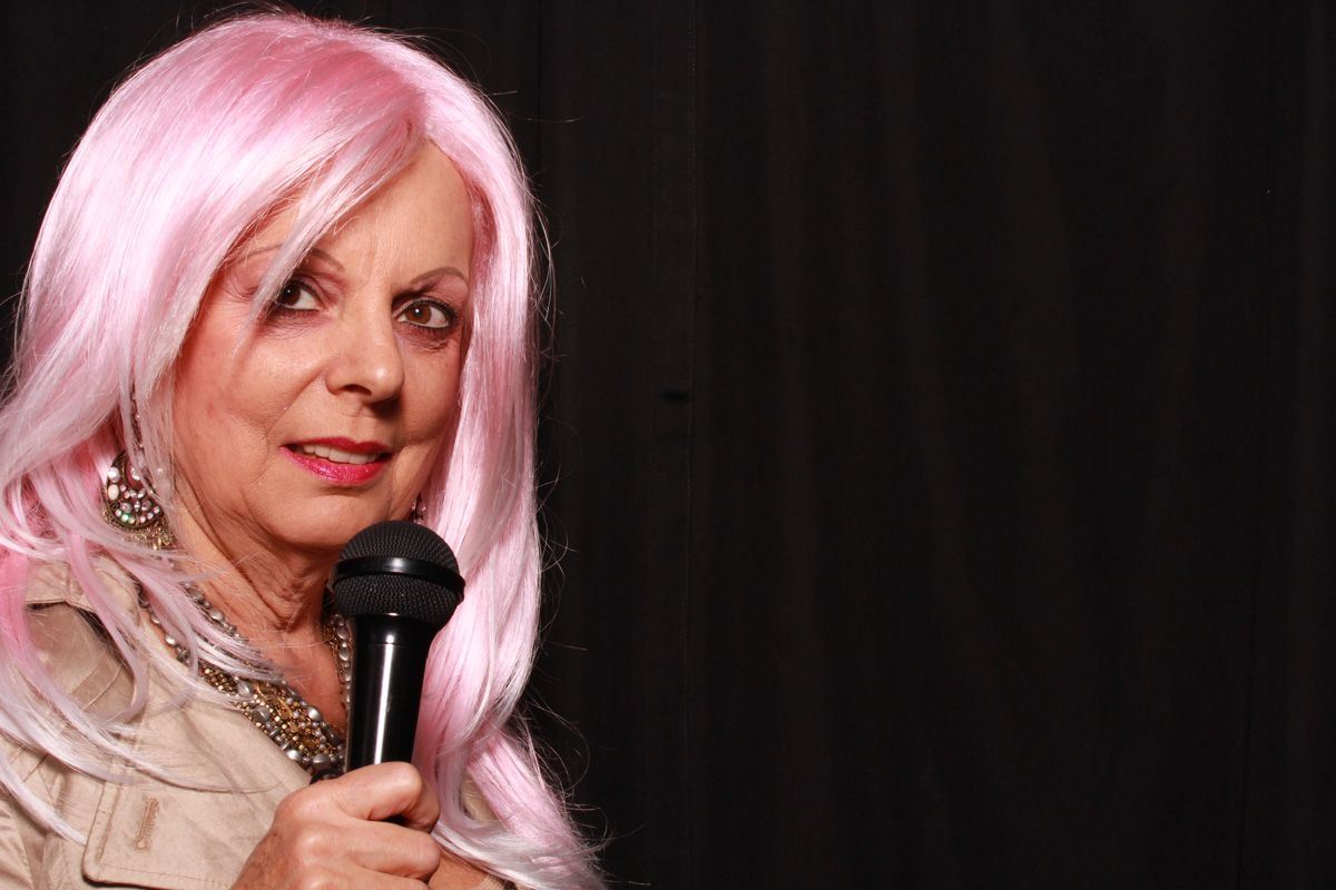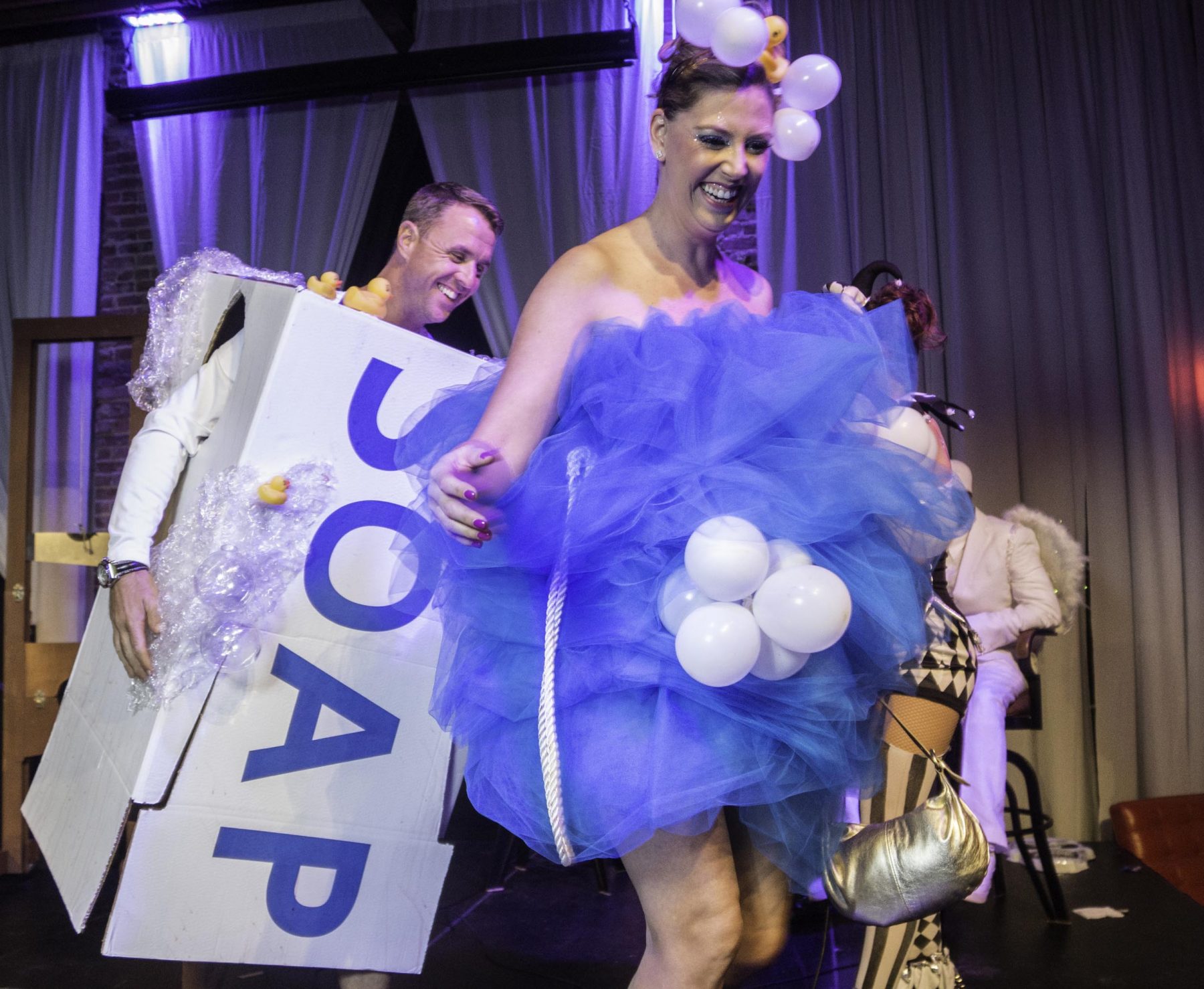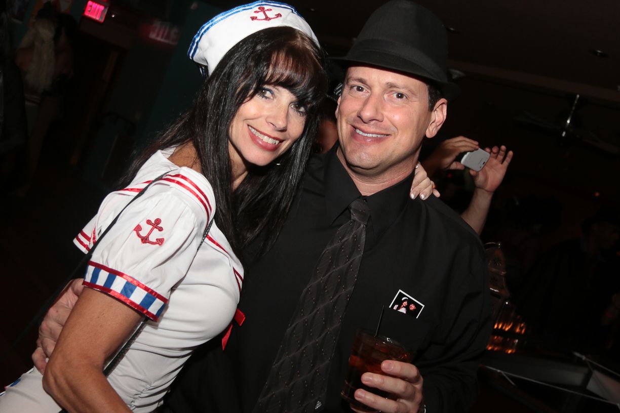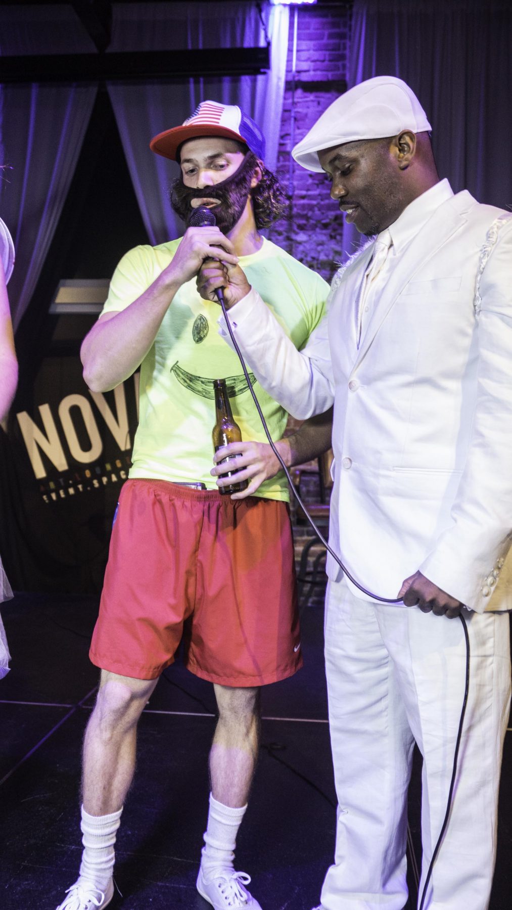 Gypsy, standing with microphone, Jon LaBude in red seated next to Daniel Jefferson2014-10-31-NOVAWEEN-8-Costume-Contest-Gypsy-Jon-Daniel-Soap-Couple