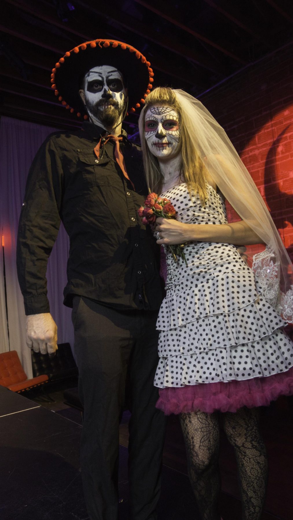 Soapy Couple being interviewed by Gypsy Allure with hosts and judges Jon “RENO” Labudde and Daniel Jefferson seated nearby..2014-10-31-NOVAWEEN-8-novaween-gobo-stairs-masked-killer