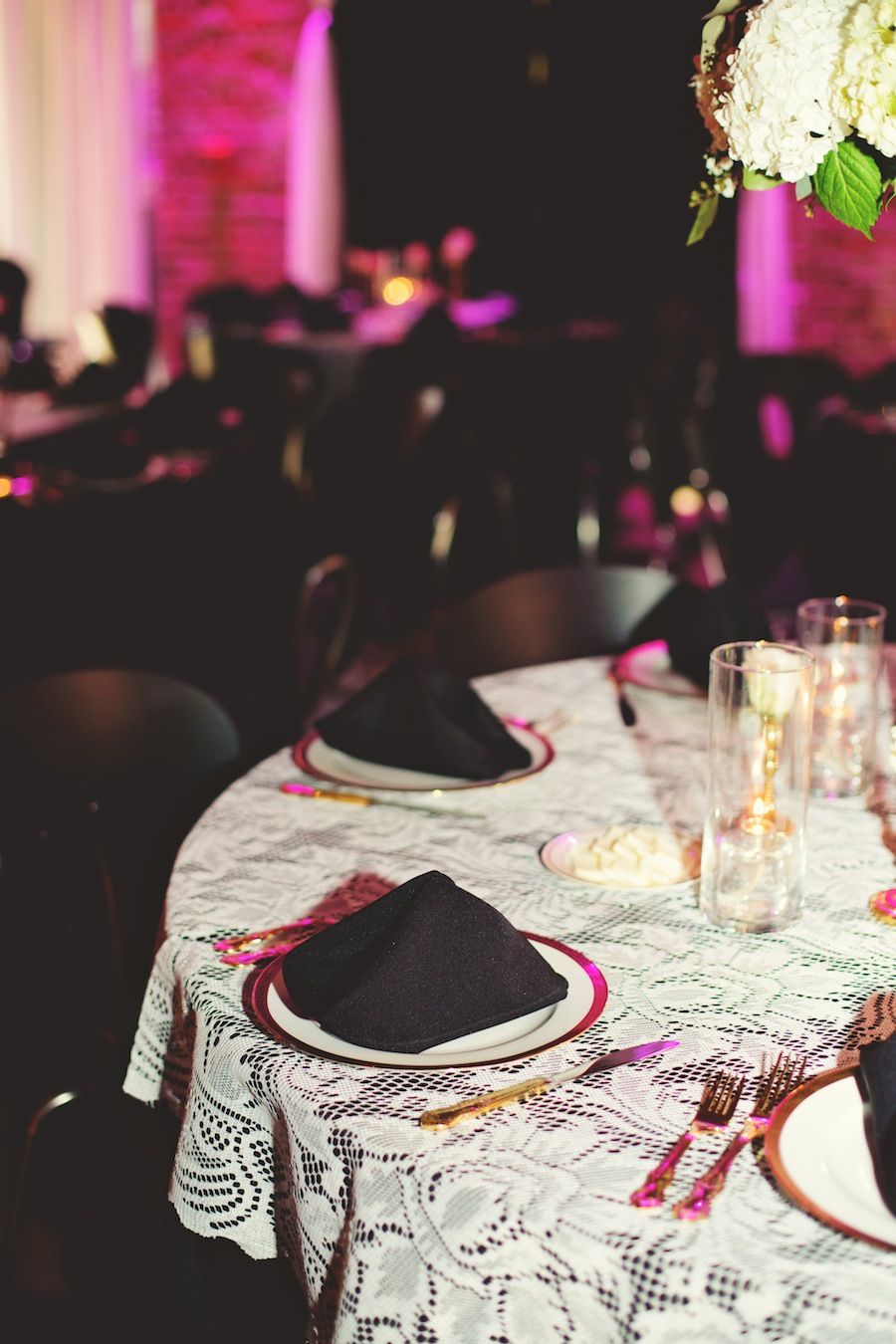 Our elegant and vintage theme was based off Gatsby-esque style: metallics, sparkles and lace. Mike liked more elegant wedding styles and rich colors; he chose the colors for the wedding: gold, black and ivory. It was the first thing we did after becoming engaged! His alma mater is the University of Central Florida and the colors worked well for what we had in mind for a decor theme.